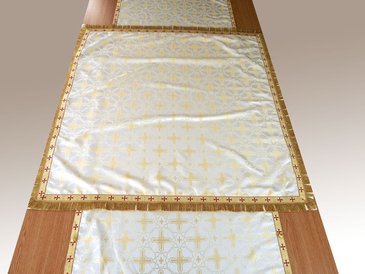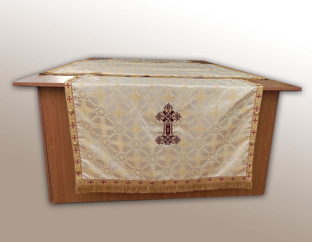 Acoperamant pentru Sfanta Masa din material bisericesc auriu cu model stilizat de cruci.