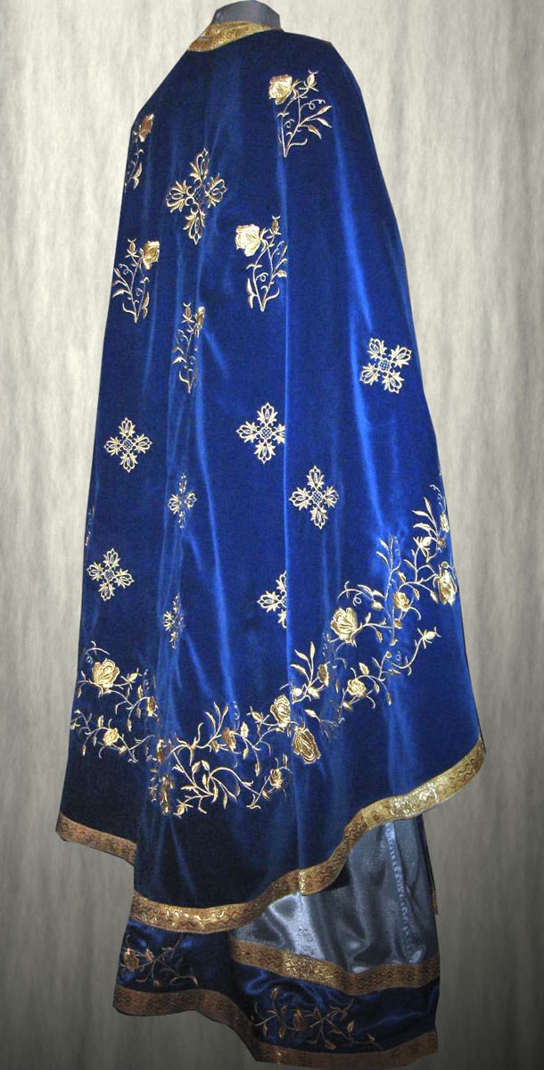 Vesmant din catifea albastra brodata cu modele de cruci si rug de trandafiri.