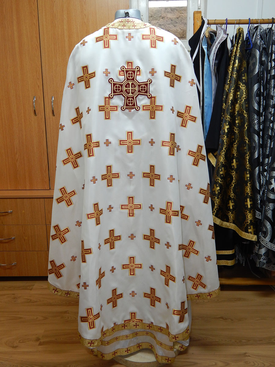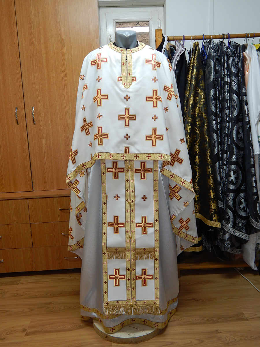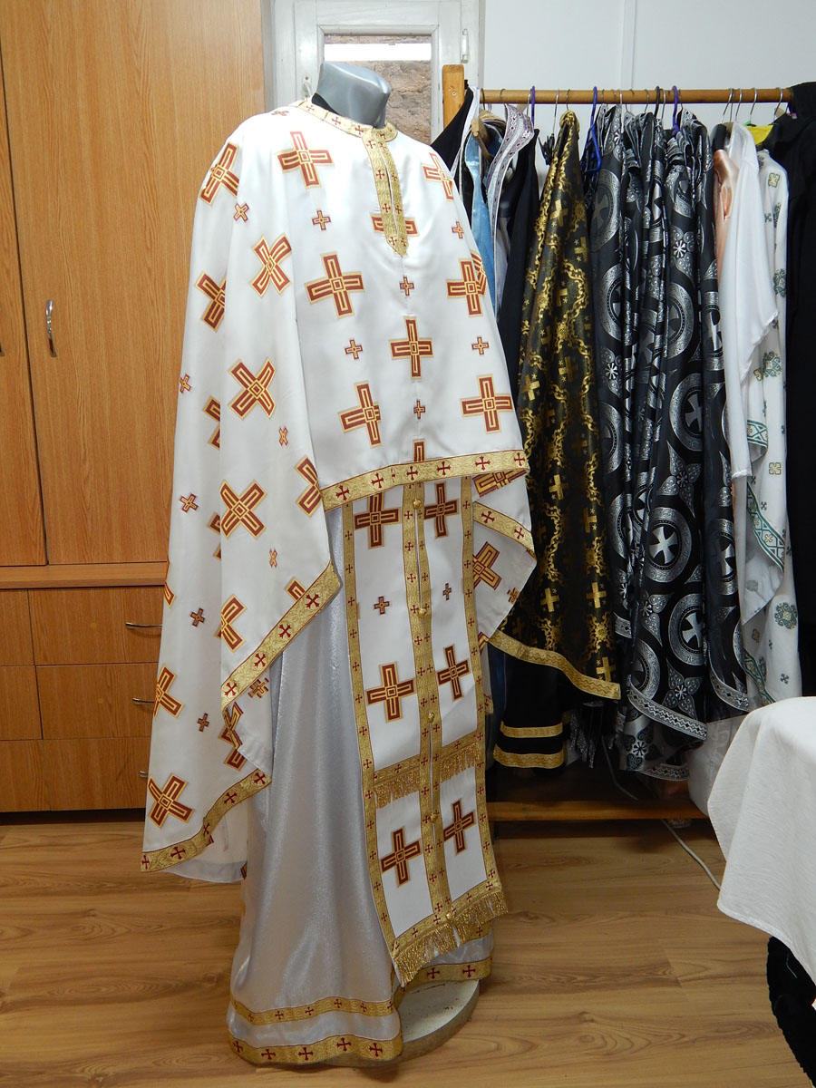 Vesmant din material bisericesc subtire cu cruci rosii.