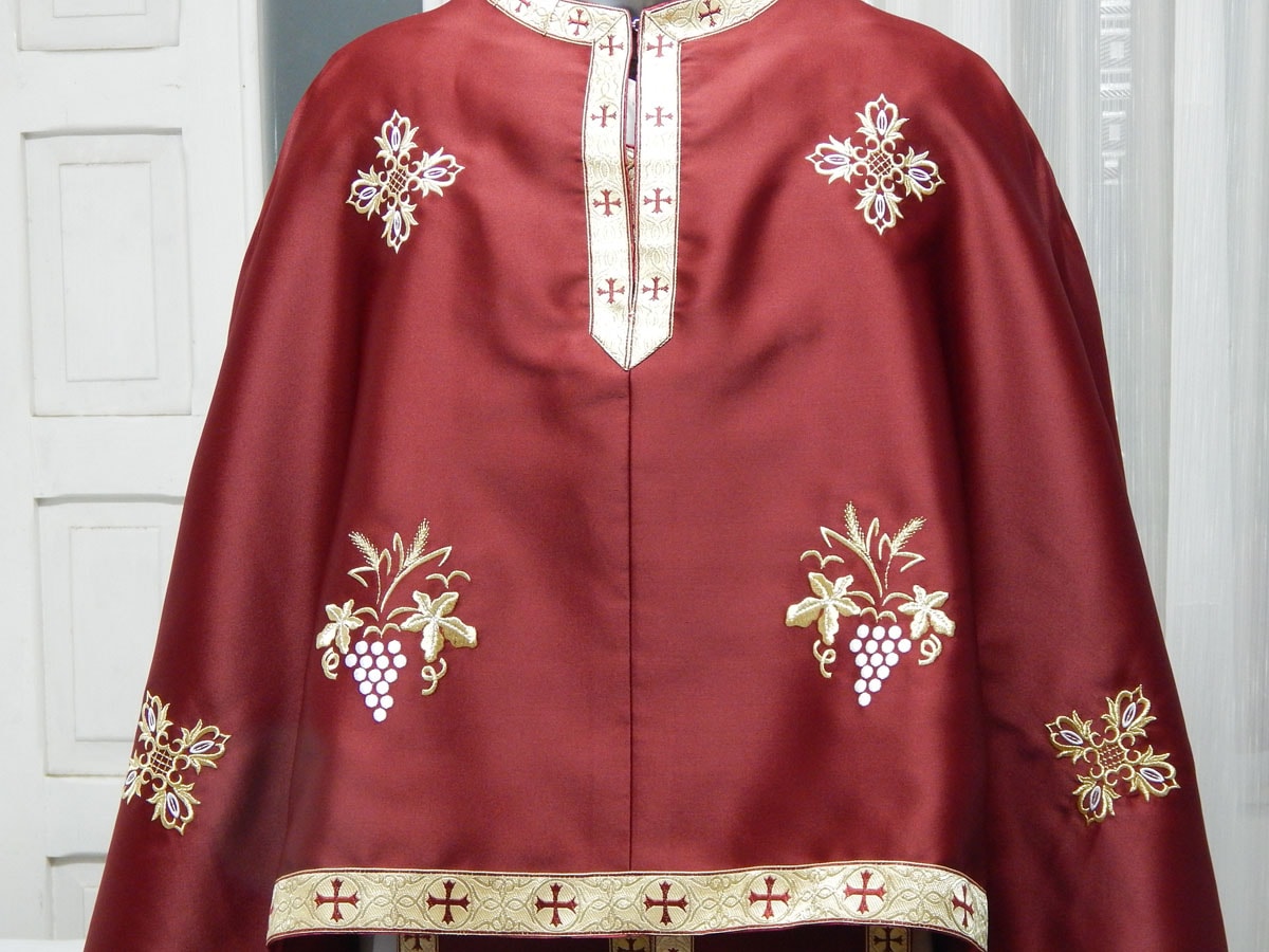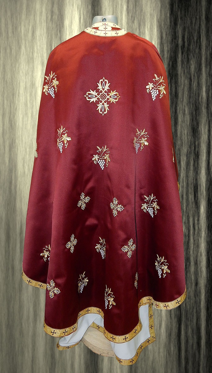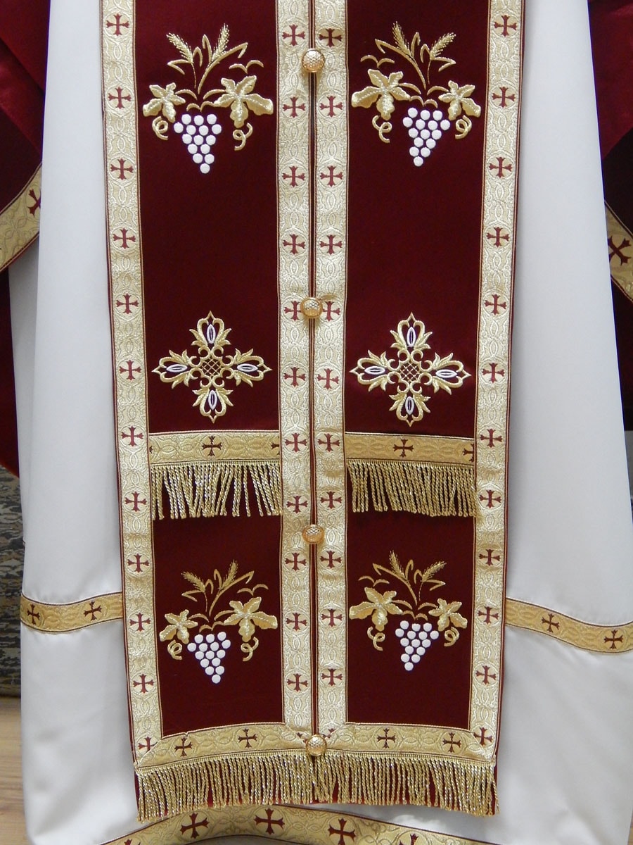 Vesmant din material subtire grena, brodat cu model cu struguri, spice si cruci.